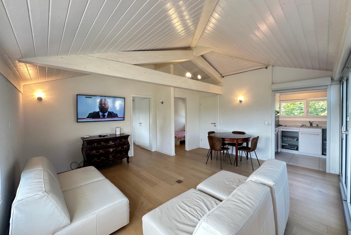 - Chambres spacieuses : Dont une magnifique chambre avec de grandes fenêtres, plafond en bois incliné et placards intégrés, créant une atmosphère chaleureuse et fonctionnelle